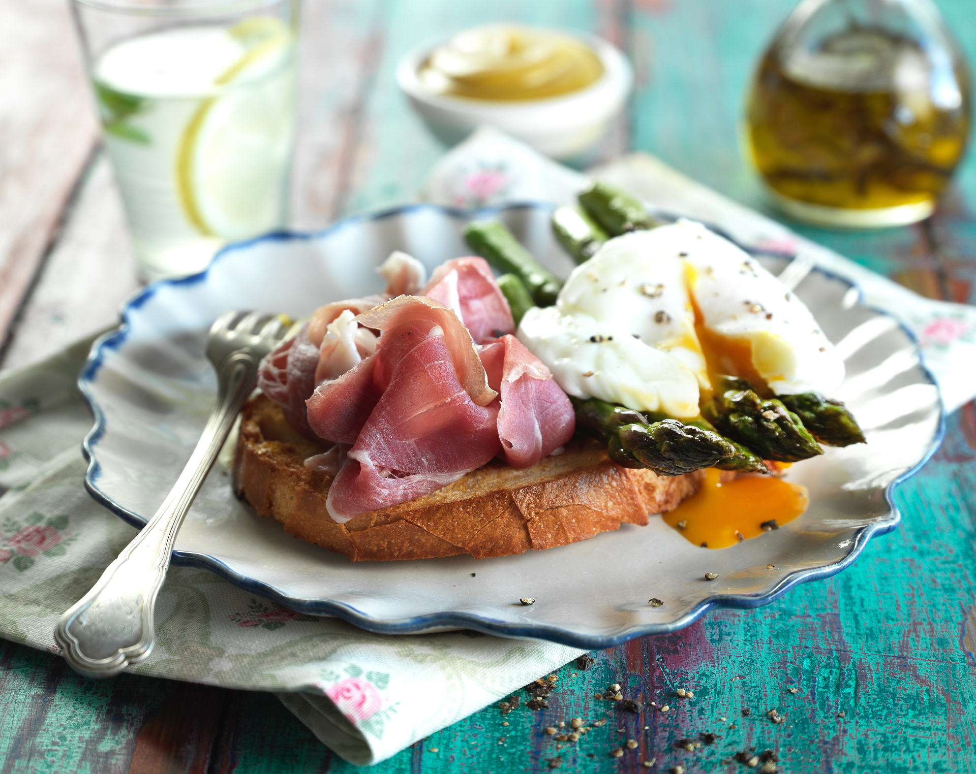 Para el armado de las bruschettas colocar una feta de jamón crudo en cada una de las rodajas de pan, encima disponer 3 puntas de espárragos y el huevo poché. Moler un poco de pimienta negra sobre la bruschetta y servir.