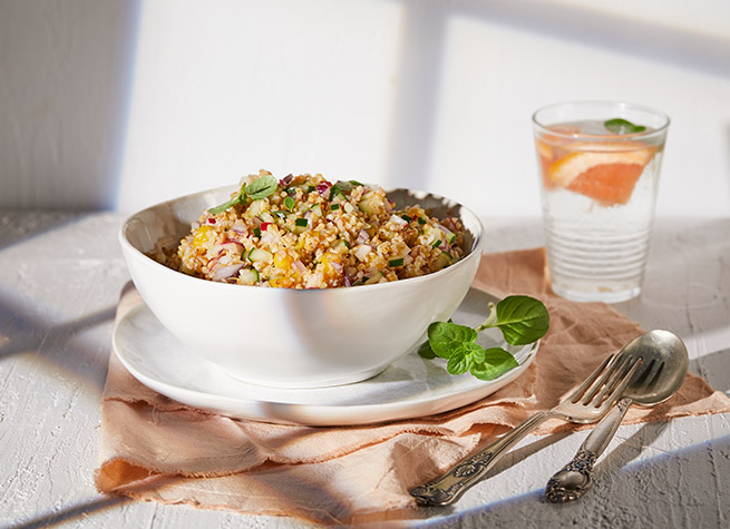 Servir la ensalada de cous cous decorada con hojas de menta.