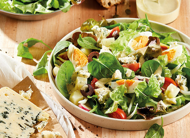 Por encima de las lechugas incorporar los tomates cherry cortados al medio, los rabanitos en rodajas finas, la cebolla en juliana, las chauchas y las papas hervidas. Agregar los huevos cortados en cuartos y el queso azul.