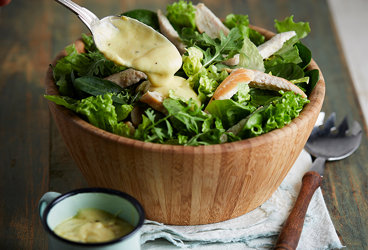 Ensalada de pollo y hojas verdes condimentada con salsa de mostaza