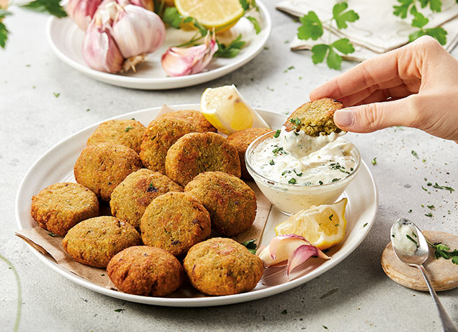 Luego del reposo en heladera formar pequeñas bolitas de 2 cm. aproximadamente y, en una sartén, calentar abundante Aceite Puro de Girasol Natura, freír los falafeles de a tandas, girándolos para que se doren de todos sus lados, escurrirlos sobre papel de cocina.