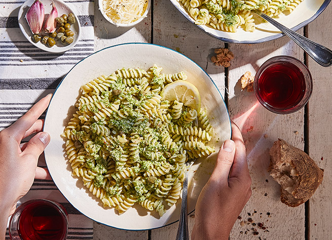 Mientras tanto, para el pesto, procesar las hojas de kale con las nueces, el diente de ajo pelado, el jugo de limón, las alcaparras y el queso parmesano. Salpimentar y agregar el Aceite de Oliva Selección Natura en forma de hilo a medida que se procesan los ingredientes.