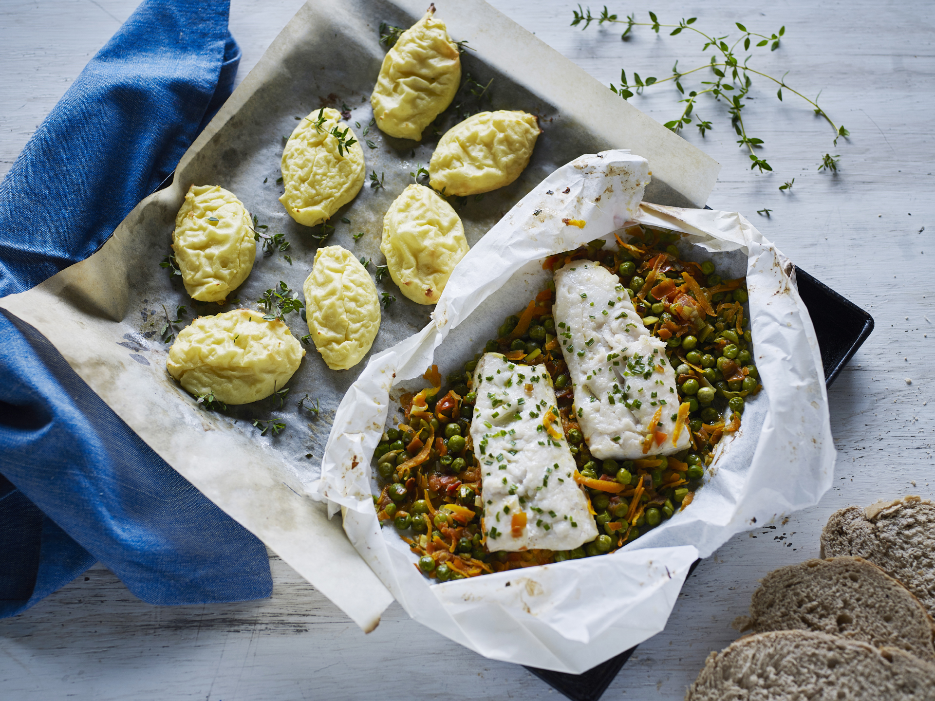 Retirar el pescado, colocar un paquete en cada plato, abrir apenas y servir bien caliente con el aluminio acompañado de las papitas duquesa.