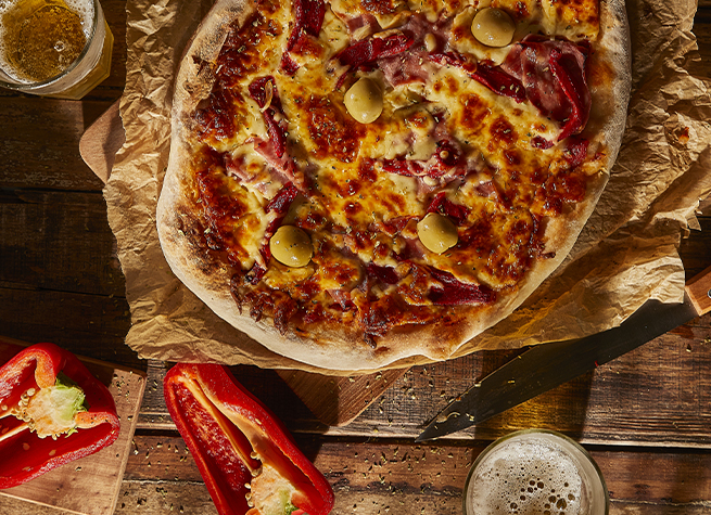 Pizza de jamón y morrones