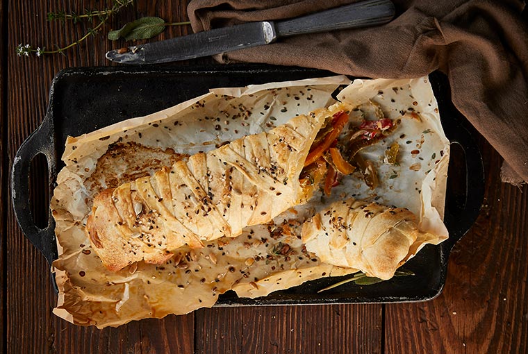 Para el armado del strudel disponer el disco de masa sobre papel manteca lubricado con Rocío Vegetal Oliva Natura. En el centro, por lo largo, distribuir el queso crema y sobre éste los vegetales. Cubrir el relleno con uno de los lados de masa sellando bien. Con la masa del otro lateral realizar cortes perpendiculares al relleno sin llegar a este y cerrar el strudel.