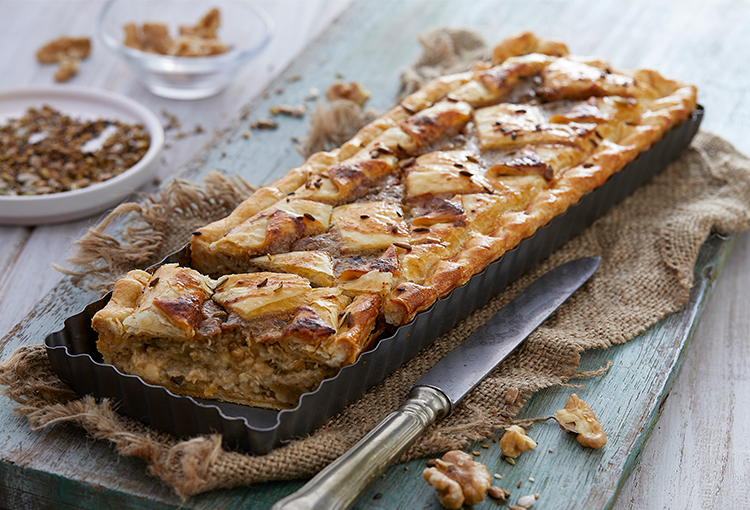 Lubricar una tartera con Rocío Vegetal Natura, extender el disco de masa, volcar la mezcla y distribuir el queso fresco sobre la superficie del relleno, cubrirla con el disco restante, sellar los bordes con el repulgue deseado y llevar a horno precalentado durante 20-25 minutos hasta que la masa esté dorada. Retirar y servir.