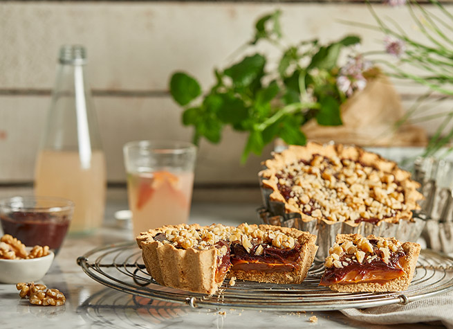 Una vez frías rellenar las tarteletas con el dulce de leche, cubrirlas con el chocolate y cuando esté tibio decorarlas con las nueces picadas.