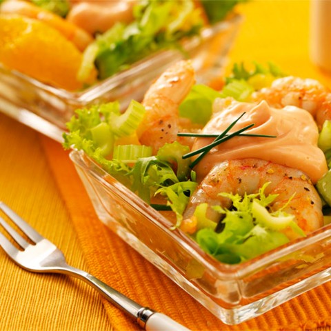 Cocinar 600 gr. de langostinos durante dos minutos en un recipiente pequeño con agua hirviendo. Retirar los langostinos, escurrirlos, limpiarlos cuidadosamente y reservarlos. Mezclar 120 gr. de apio picado, 120 gr. de gajos de naranja y 60 gr. de ciboulette picado.