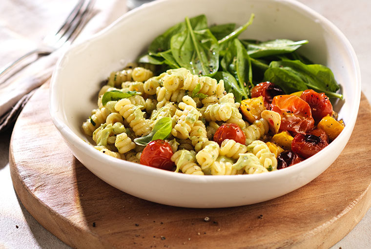 Ensalada de fusillis con cherrys confitados y aderezo de palta
