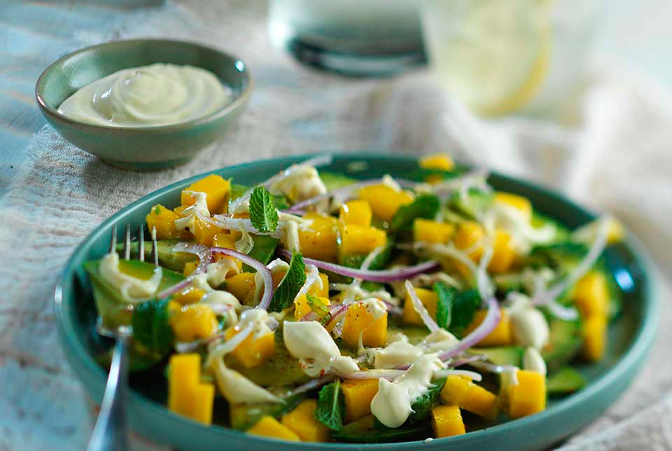 Colocar las frutas en una ensaladera, rociar con el jugo del limón e incorporar los echalotes bien escurridos. Condimentar con la salsa de yogur, decorar con hojas de menta. Puede servirse en copas individuales como entrada.