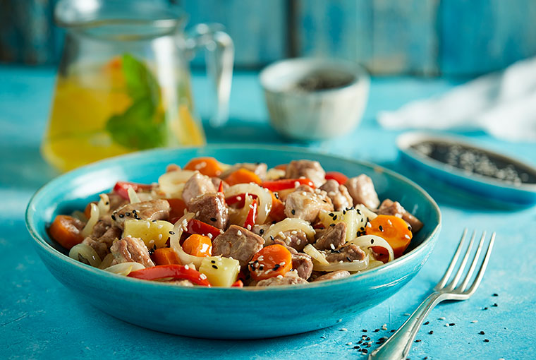 Continuar la cocción a fuego bajo, revolviendo cada tanto y agregar un poco de agua en el caso de que el fondo de cocción se seque. Una vez que los vegetales estén cocidos, retirar y servir caliente acompañado de la salsa agridulce.