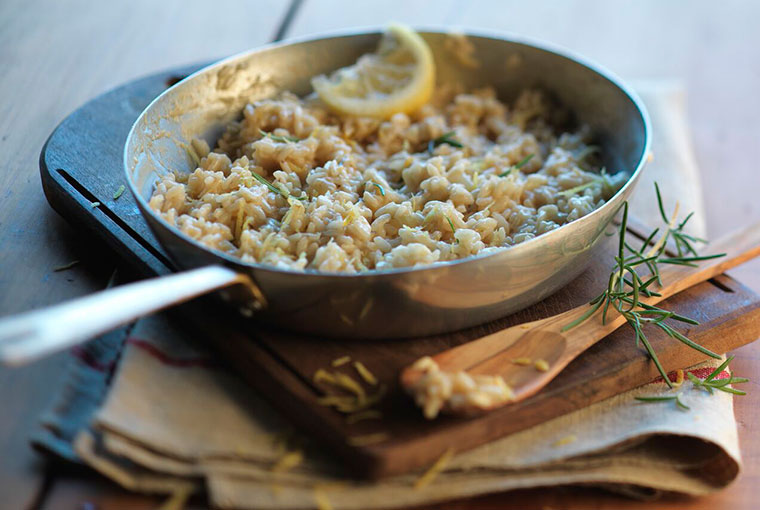 Aparte, rehogar la cebolla y el apio en una sartén a fuego bajo durante 5 minutos con la mitad de la manteca y el Aceite de Oliva Clásico Natura, cuidar que no se doren. Agregar el arroz y revolver hasta que se cubra de aceite y se ponga algo transparente. Agregar un cucharón de caldo y revolver con cuchara de madera constantemente. Cuando se haya consumido agregar más caldo sin dejar de revolver. Continuar agregando caldo cada vez que sea necesario hasta que el arroz esté al dente. Incorporarle la mezcla al limón reservada y la manteca restante, revolver con fuerza hasta que se derrita la manteca y la textura del arroz sea más cremosa y brillante. Espolvorear con el resto del parmesano y servir.
