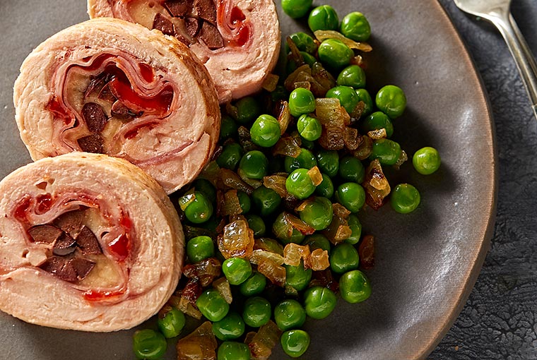 Servir el roll de pollo acompañado con la guarnición de arvejas salteadas.