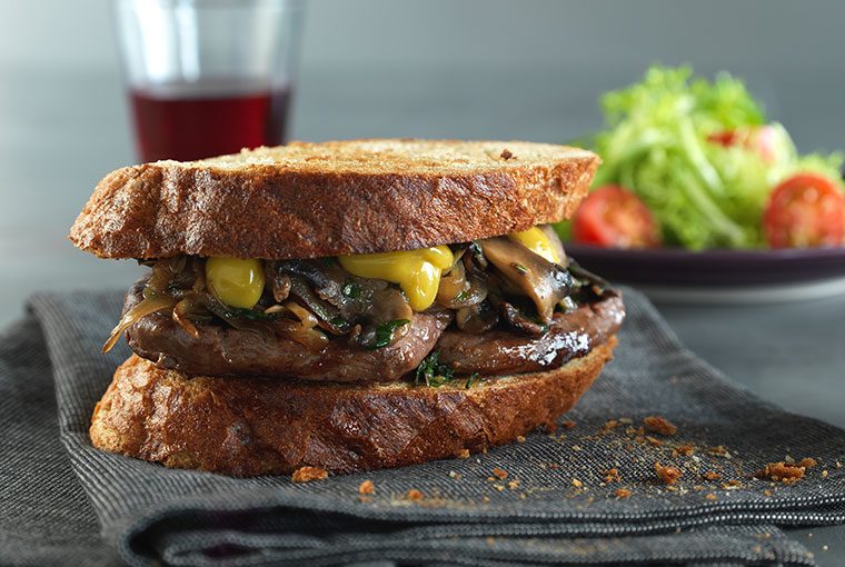 Para el armado del sándwich, abrir los panes a la mitad. Untar los bifes con la Mostaza Natura. Disponer un bife de lomo en cada pan, colocar encima las cebollas y los champiñones rehogados, por último completar con fetas de queso fontina. Cubrir con la otra tapa de pan.