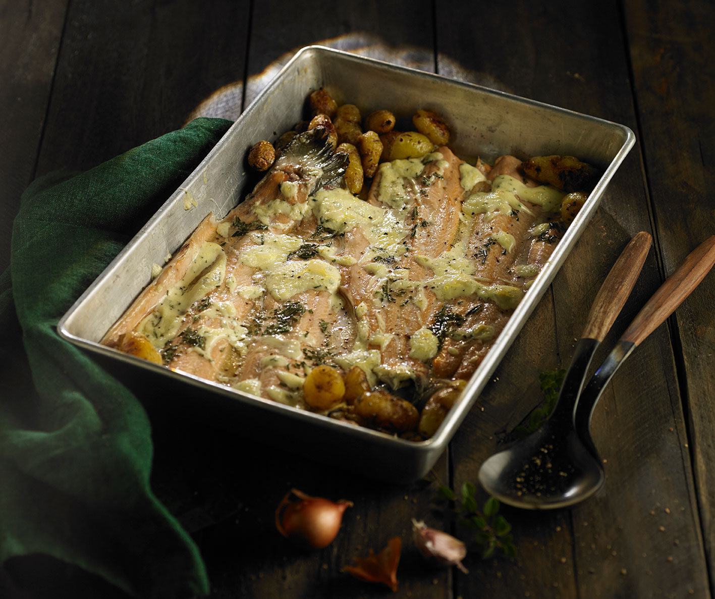 Servir los filetes de trucha acompañados de las papas y la mayonesa al romero.