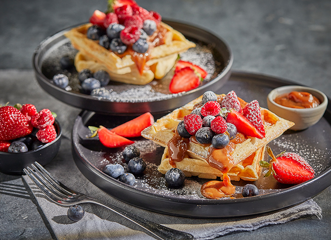 Servir los waffles acompañados por el dulce de leche y los frutos rojos limpios y escurridos. Decorar con hojas de menta y/o azúcar impalpable a gusto.